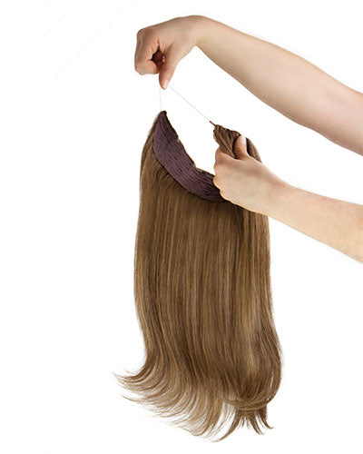 Halo™ Extensions instantly increases volume and maximizes length for a gorgeous head of invisible hair extensions in less than 5 minutes. Made from 100% Remy human hair extensions and placed on a hand-sewn weft, the Halo™ Extension stretches to fit every head shape and size. This must-have accessory is for every woman looking to add volume, length, and effortless style, anytime – and without any damage.